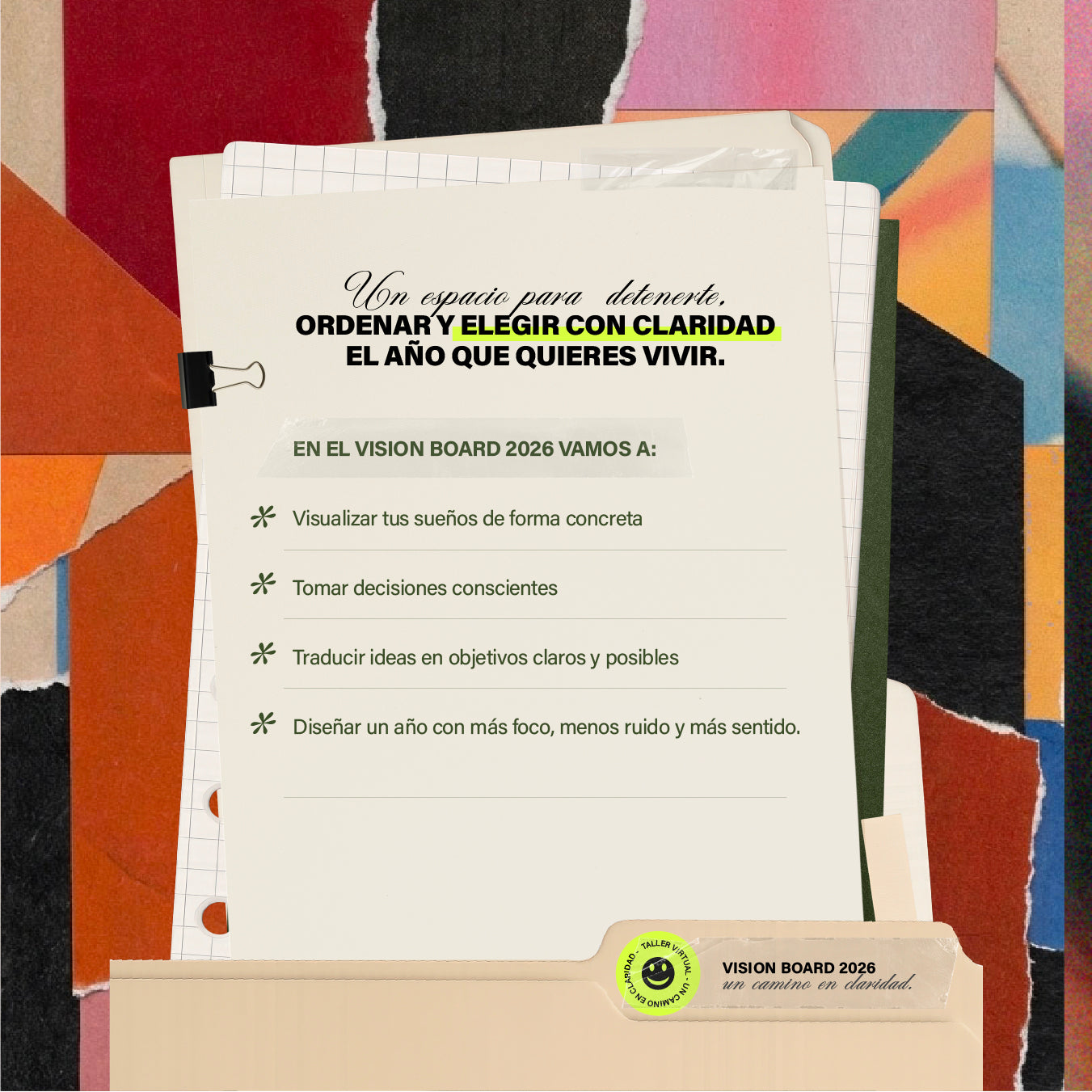 Este taller de Vision Board 2026 es una invitación a detenerte, ordenar tus ideas y diseñar conscientemente el camino que quieres habitar. No se trata solo de soñar, sino de visualizar con claridad, decidir con intención y construir paso a paso el año que deseas vivir.